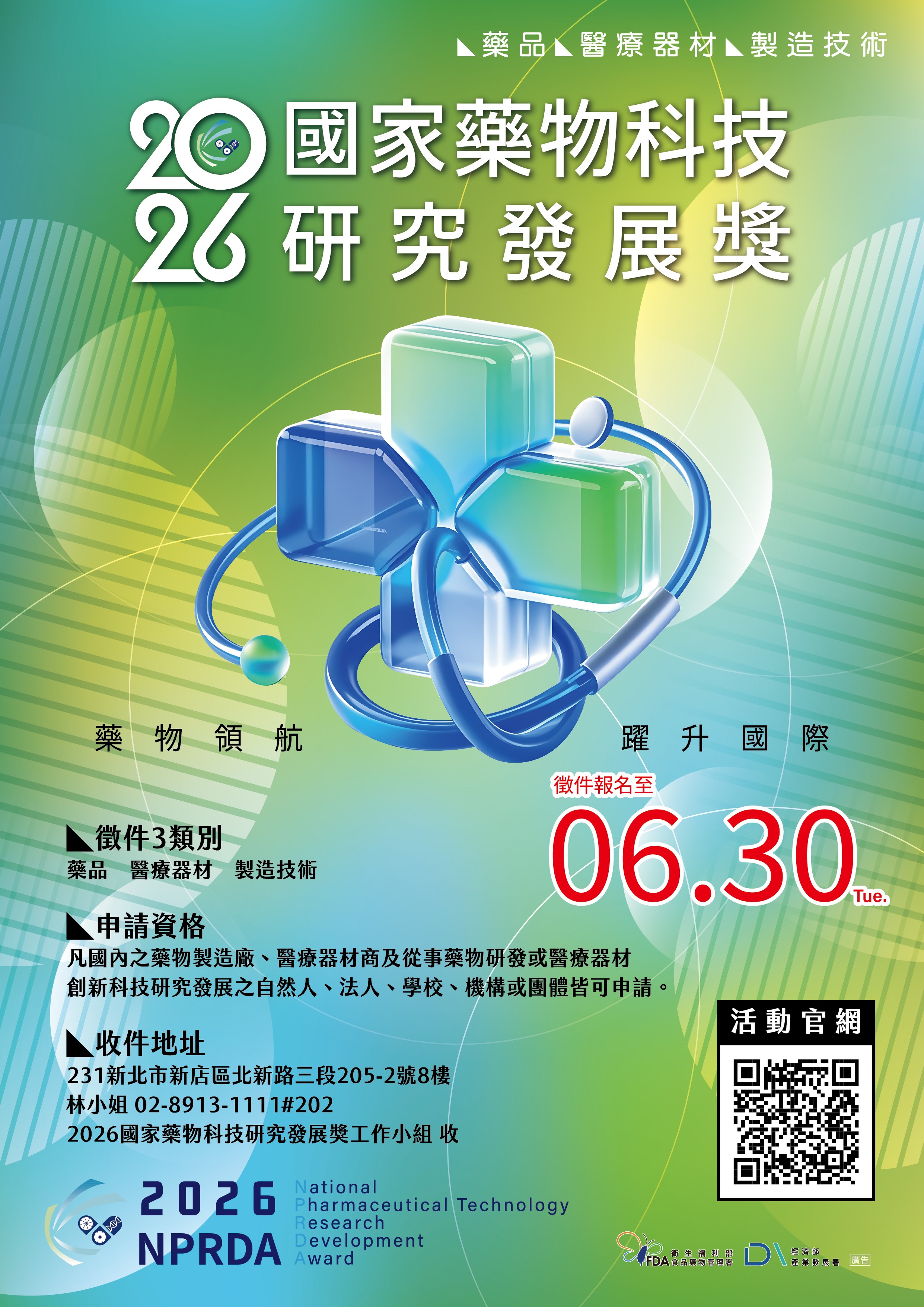 115年度「國家藥物科技研究發展獎」自公告日起至115年 6月30日止受理申請,請協助公告並轉知會員及相關研究人員踴躍參與選拔。