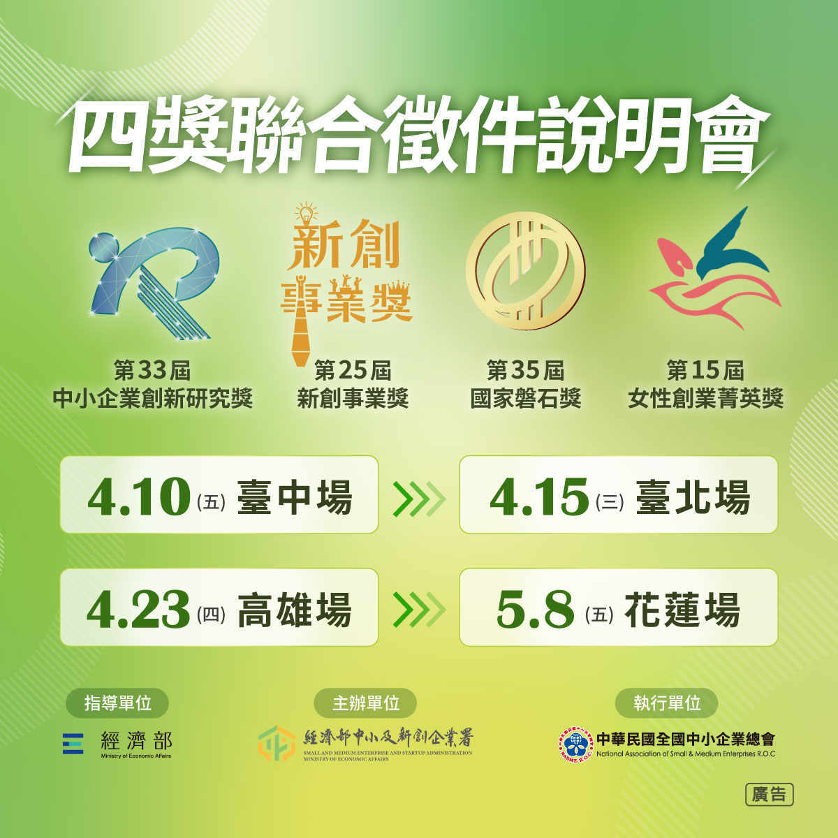 一、為鼓勵中小企業追求卓越、推動創新,今年4月起於北、中、南、東舉辦「創新研究獎、新創事業獎、國家磐石獎、女性創業菁英獎-四獎聯合徵件說明會」。